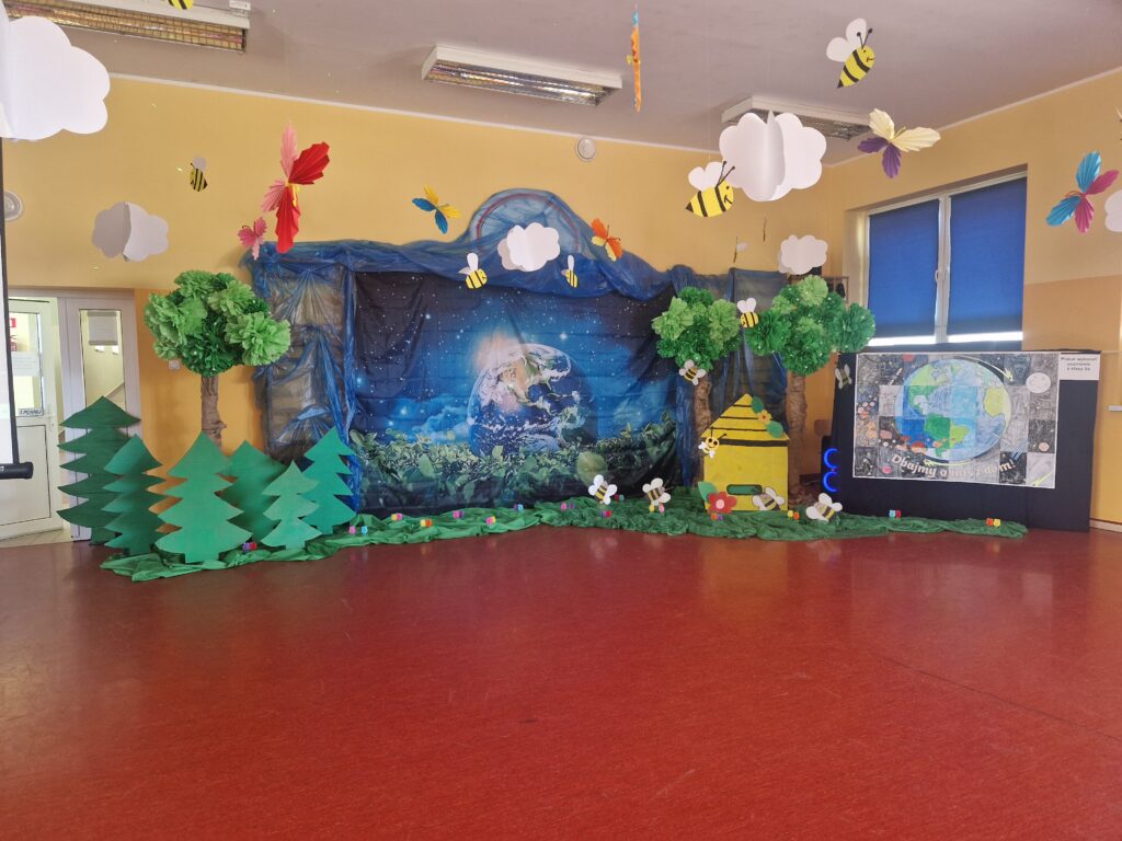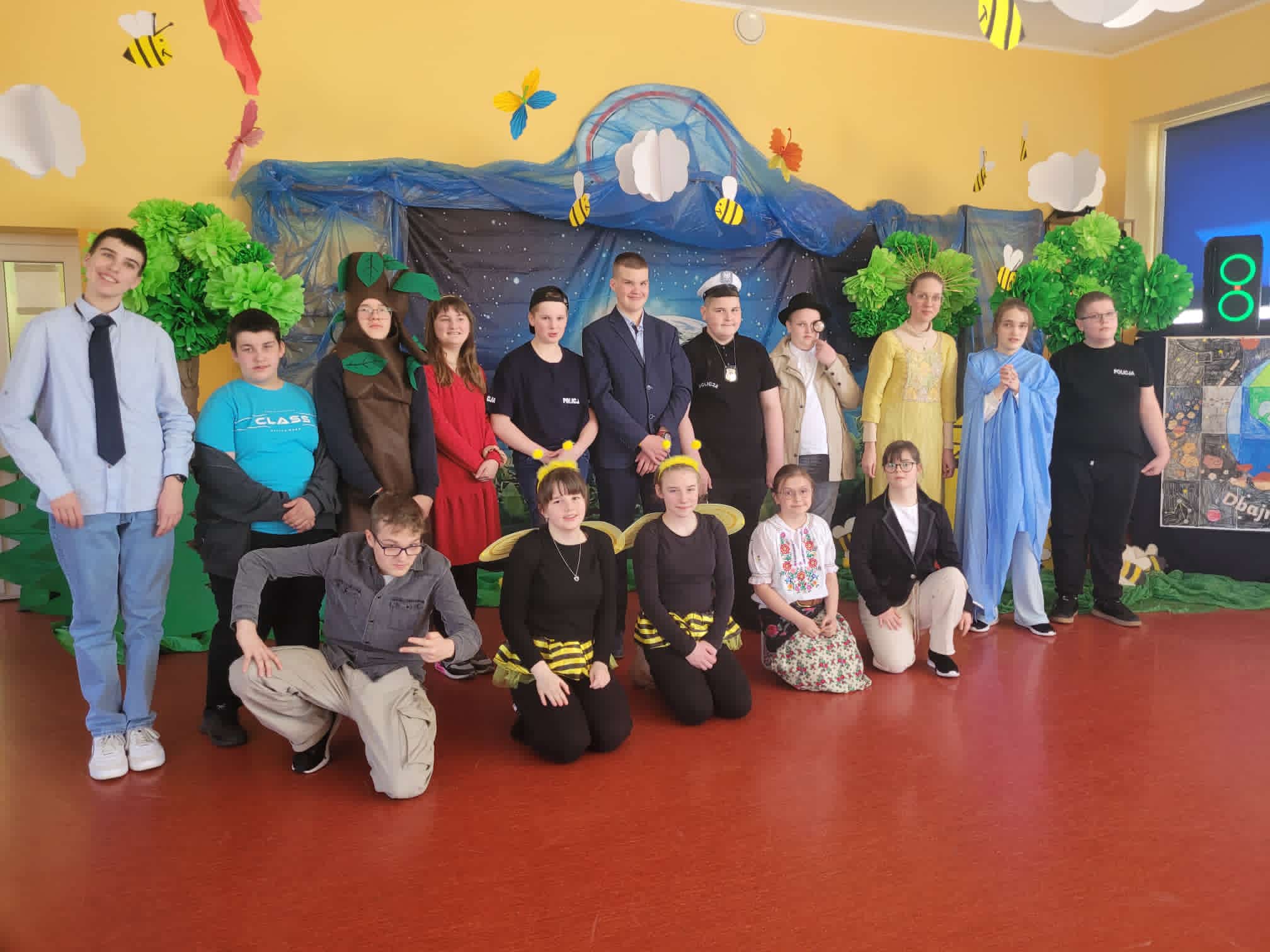 Podczas przedstawienia uczniowie zaprezentowali poruszającą historię Ziemi, która – zmęczona działalnością człowieka – szukała nadziei na poprawę swojego losu. W kolejnych scenach widzowie mogli zobaczyć, jak natura „zabiera głos” – swoje problemy przedstawiały m.in. las, powietrze i rzeka, zwracając uwagę na zagrożenia wynikające z zanieczyszczeń i niewłaściwych działań człowieka. Nie zabrakło również elementów humorystycznych, takich jak scenka z detektywem i policjantami poszukującymi „winnych” zaśmiecania Ziemi czy zabawny wywiad z pszczołami, który jednocześnie niósł ważne przesłanie o ich roli w przyrodzie.