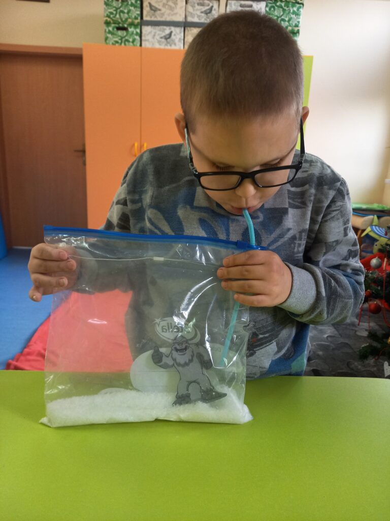 Zadaniem uczniów było dmuchanie przez słomkę wprawiając śnieg w ruch.
