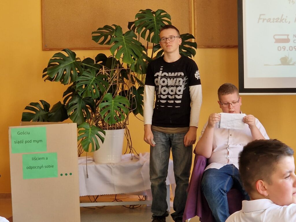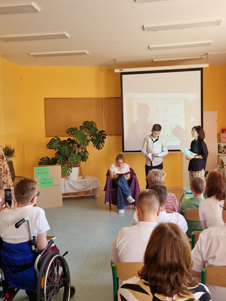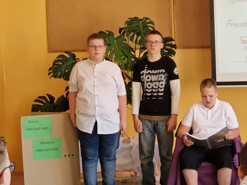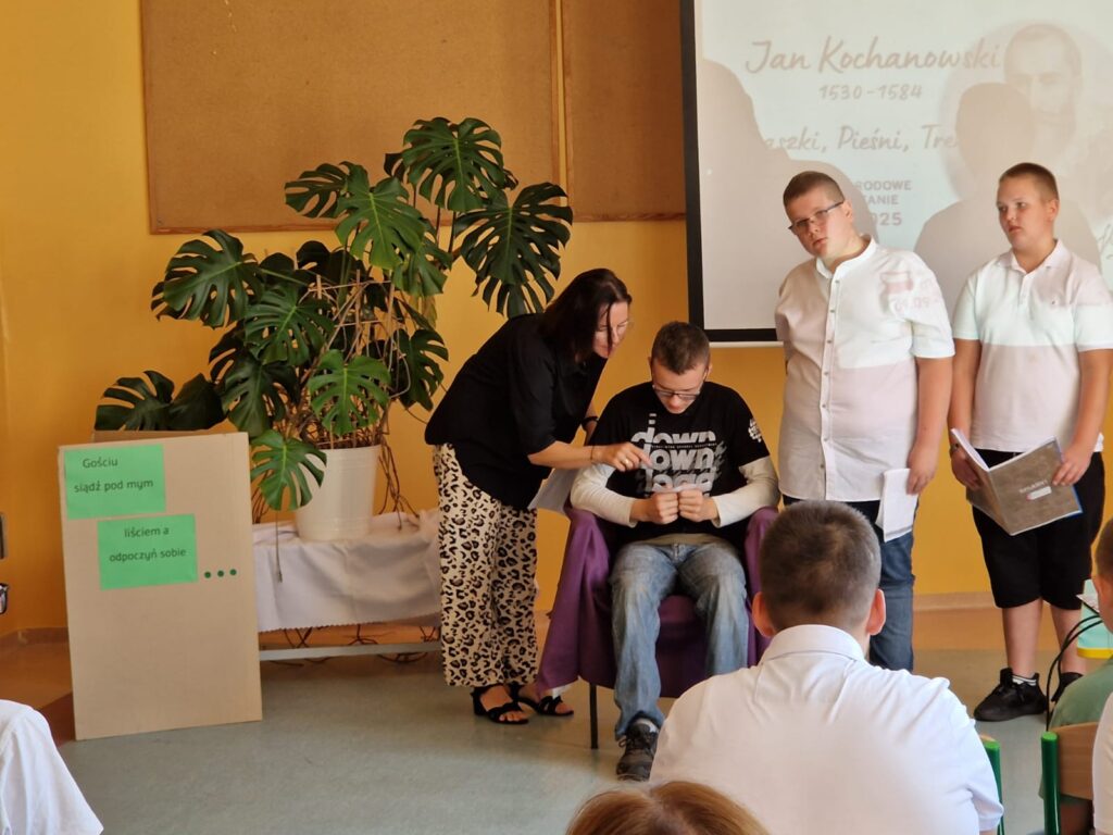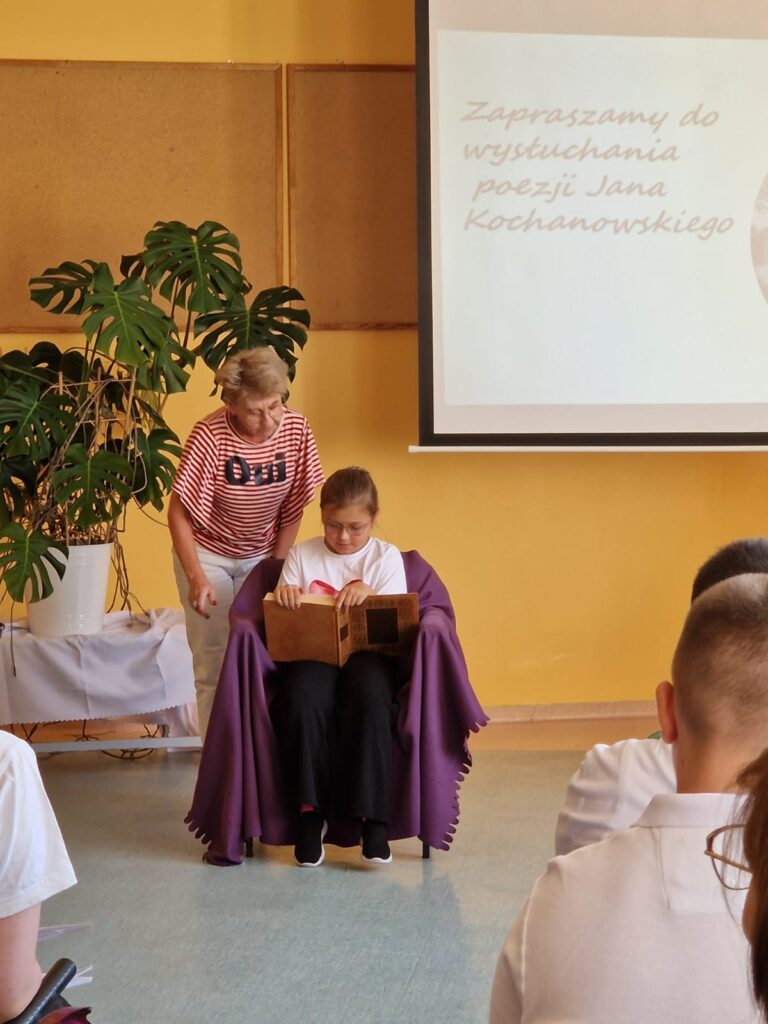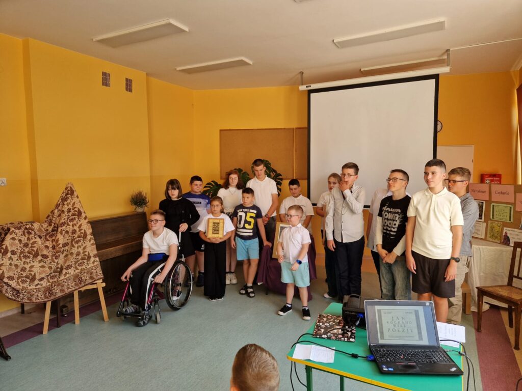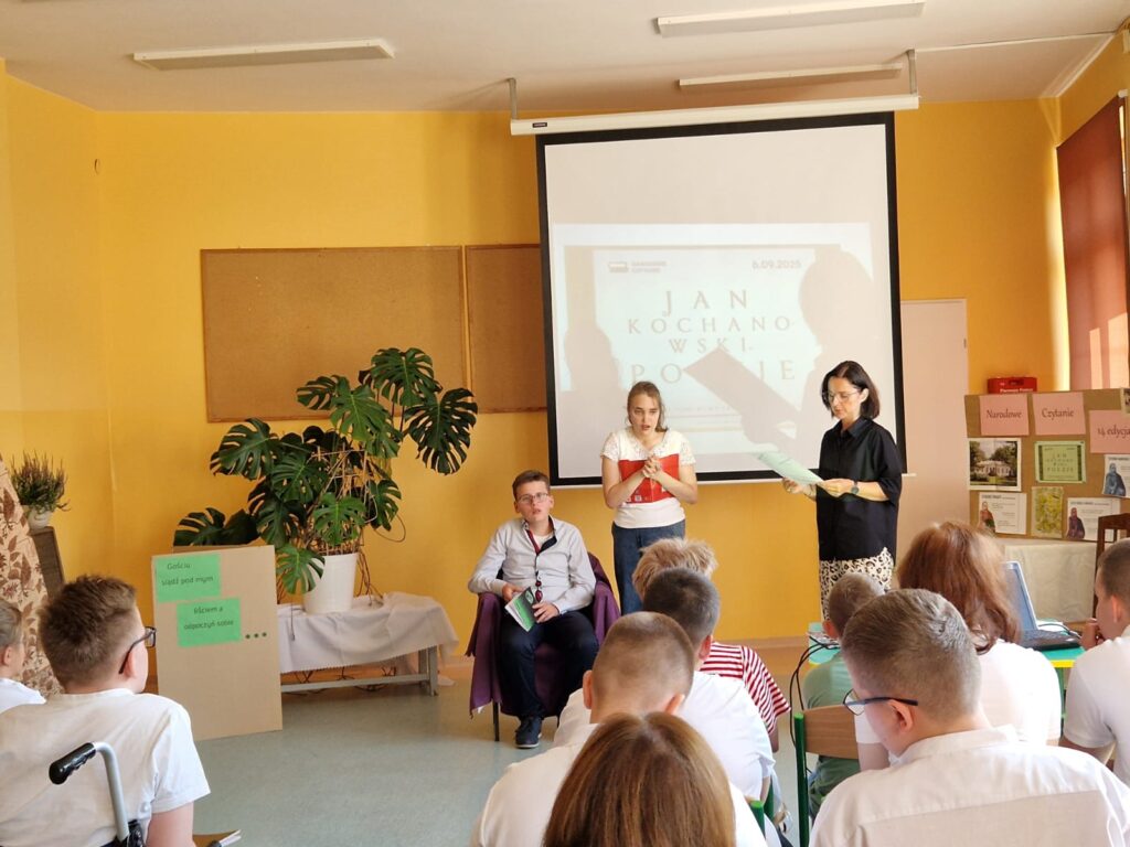 Uczniowie obejrzeli również prezentację dot. akcji i sylwetki Jana Kochanowskiego. Po przeczytaniu fraszek, pieśni i trenów uczniowie otrzymali gromkie brawa, a dyrektor szkoły – pani Hanna Ewa Strugała podziękowała czytającym za zaangażowanie, promocję czytelnictwa w szkole i wspaniałe poradzenie sobie z czytaniem trudnych językowo tekstów.