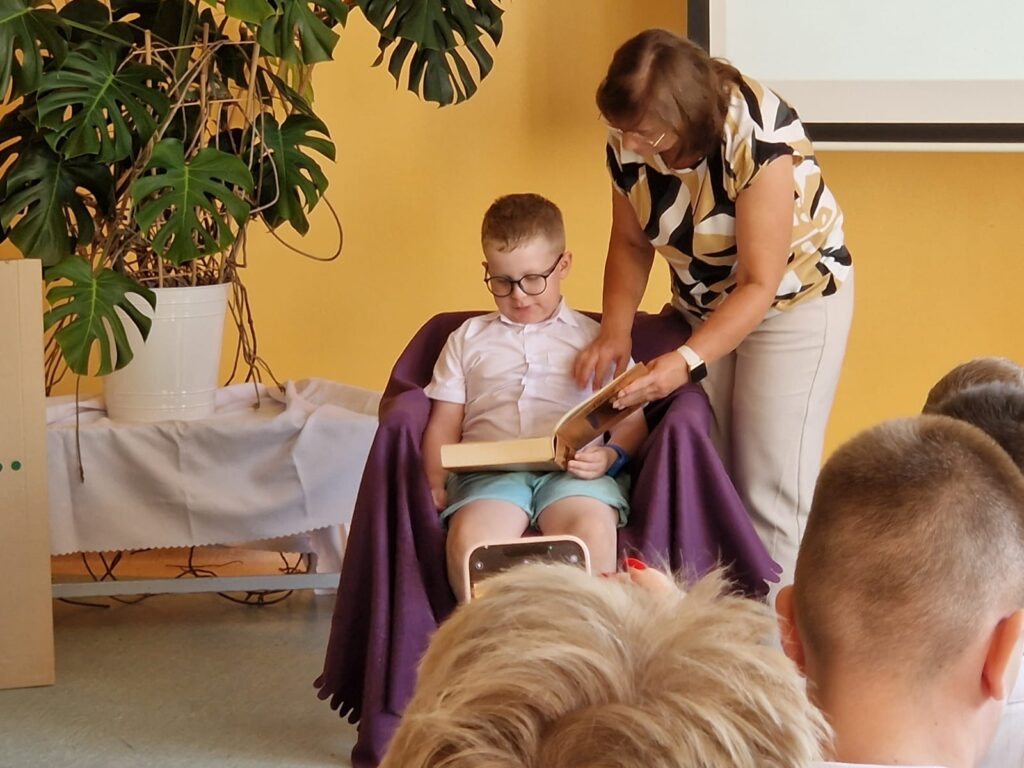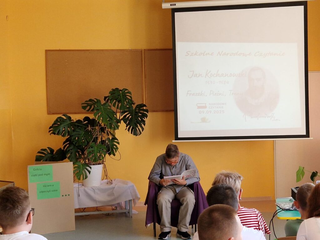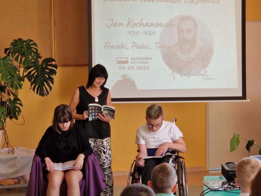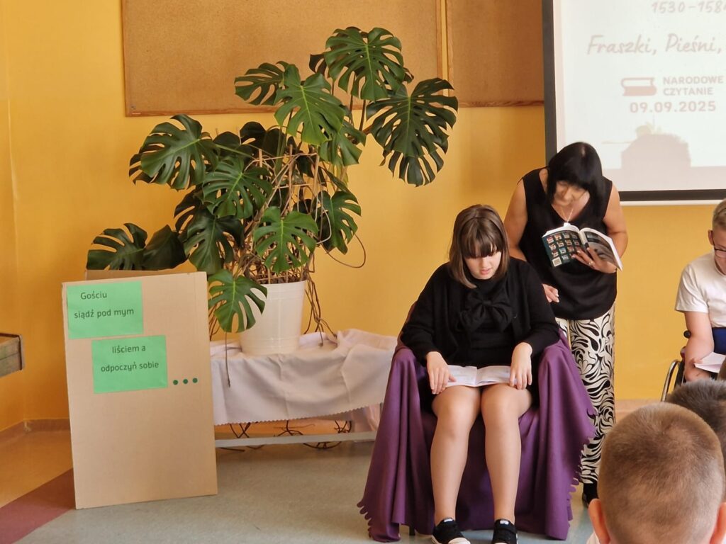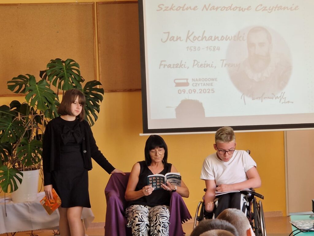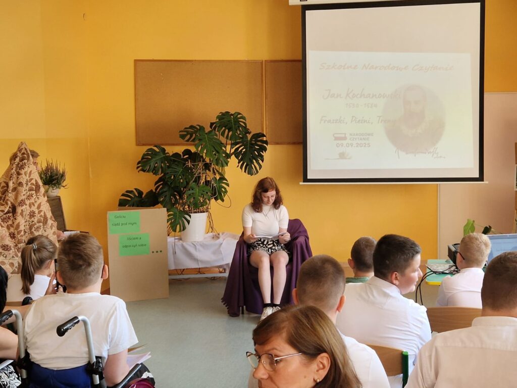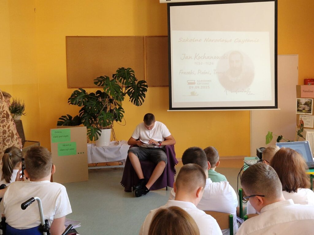 W naszej szkole 9 września 2025 r. odbyło się Szkolne Narodowe Czytanie. Uczniowie kl. 1-8 szkoły podstawowej oraz nauczyciele zebrali się w świetlicy szkolnej. Poezję Jana Kochanowskiego czytali: Fabian z kl. 1a, Karol i Gabrysia z kl. 2/3a, Hania i Alan z kl. 4a, Igor i Patryk z kl. 5a, Daniel z kl. 6a, Olek z kl. 6b, Kacper z kl. 7a, Tobiasz z kl. 7b, Szymon, Julia i Filip z kl. 8a oraz Antosia i Wojciech z kl. 8b. Uczniów wspierały w czytaniu nauczycielki – panie: Anna Łoniewska, Elżbieta Hruświcka, Mirosława Perz oraz Magdalena Biniak.